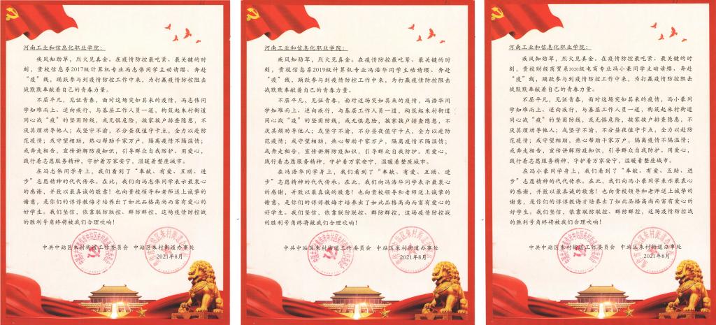 近日,我院收到了中站区朱村街道工委、办事处寄来的七封感谢信,对我院7名学生积极投身防疫一线志愿服务给予感谢和表扬。