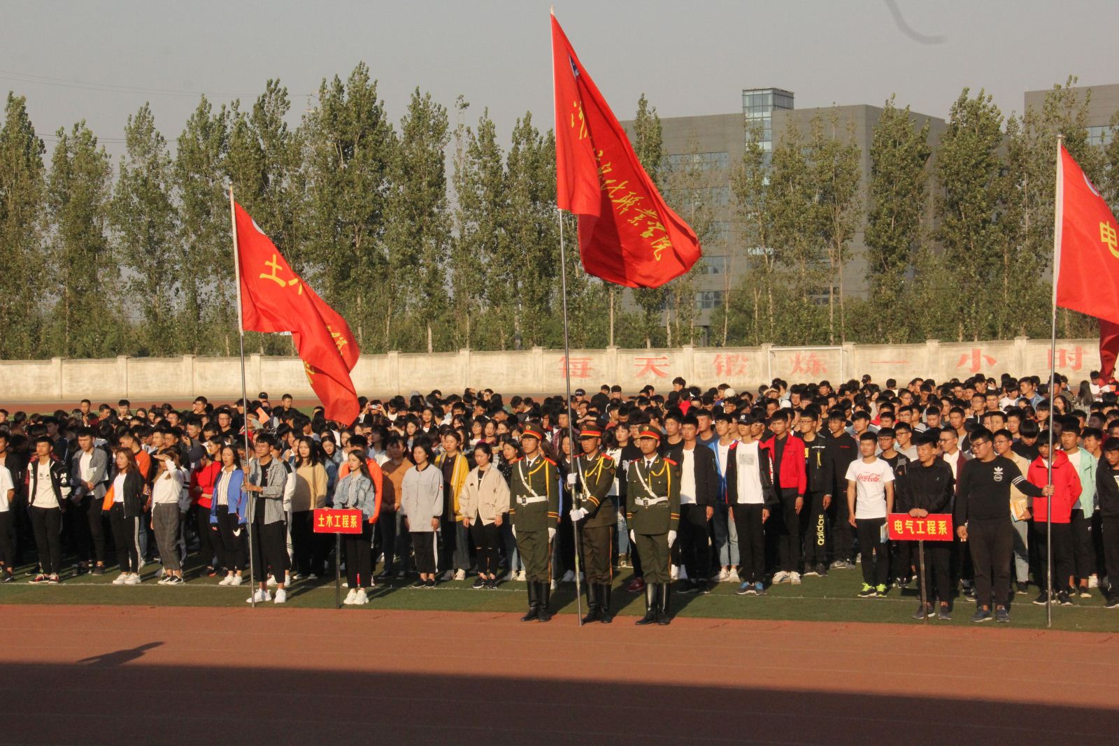10月10日下午,我院第四届秋季综合运动会在田径场隆重开幕。院领导毋虎城、张庆伟、吕况、魏道清、张红兵,教务处处长张长喜、运动会裁判长刘春定及各系部主要负责人出席开幕式,开幕式由体育部副主任苏涛涛主持。全体参赛运动员及千余名师生代表参加了开幕式。
