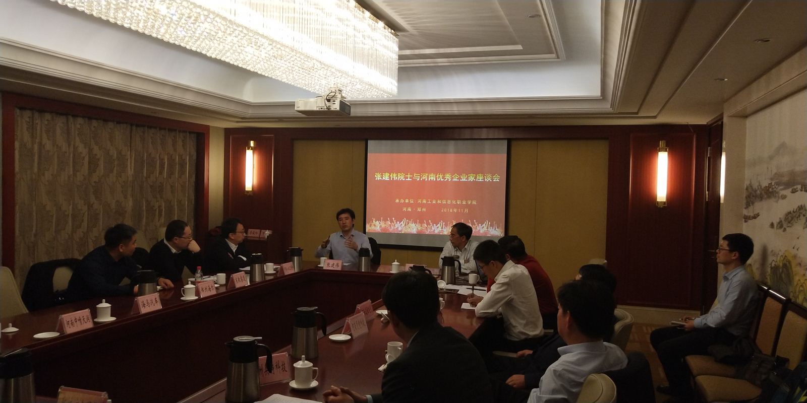 11月1日,由工业和信息化部、中国工程院和河南省人民政府共同主办,工业和信息化部科技司、人事教育司、中国信息通信研究院、中国人工智能产业发展联盟和河南省工业和信息化委员会等部门联合承办的“河南省2018人工智能发展高峰论坛”在紫荆山宾馆1号楼三楼第一会议室举行。我院领导、教师和部分校企合作企业受邀参会并组织10余家优秀企业负责人与德国汉堡科学院张建伟院士、社科院工业发展研究室邓洲副主任座谈。