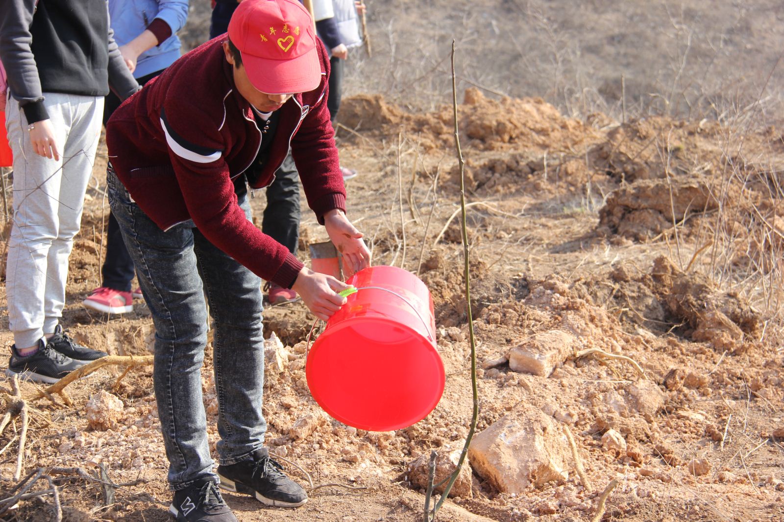 在市林业局技术人员的指导下同学们分工协作,培土、填坑、浇树,干劲十足。很快,53颗核桃树苗拔地而起。同学们头上满挂着辛劳的汗水,心中却绽开了喜悦的花。