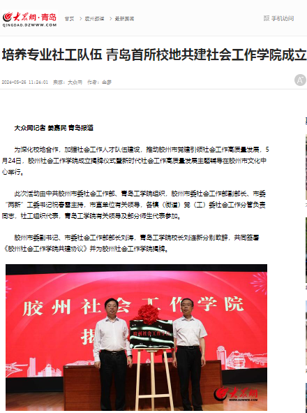 《大众网》培养专业社工队伍——青岛首所校地共建社会工作学院成立