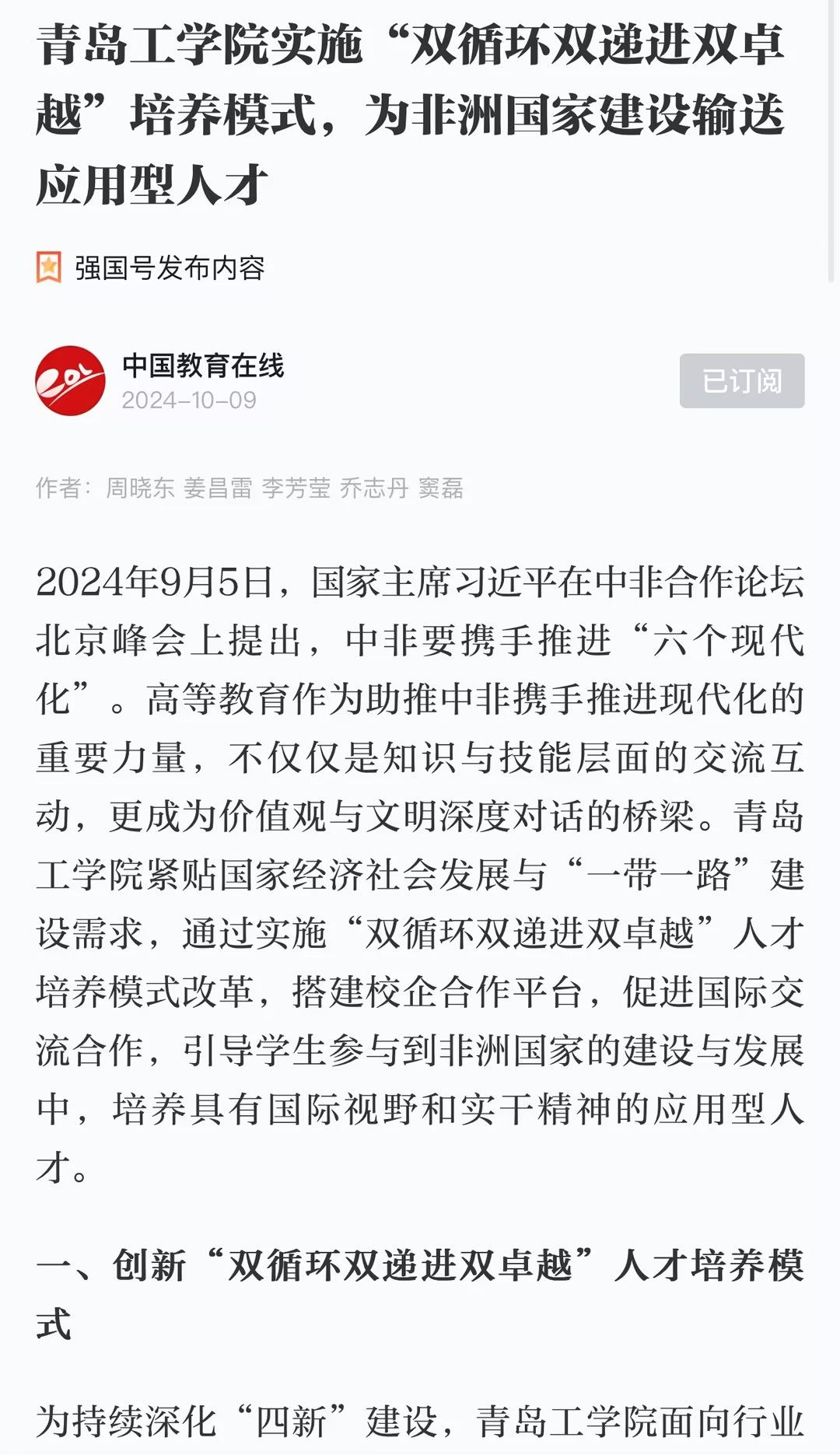 《学习强国》青岛工学院实施“双循环双递进双卓越”培养模式,为非洲国家建设输送应用型人才