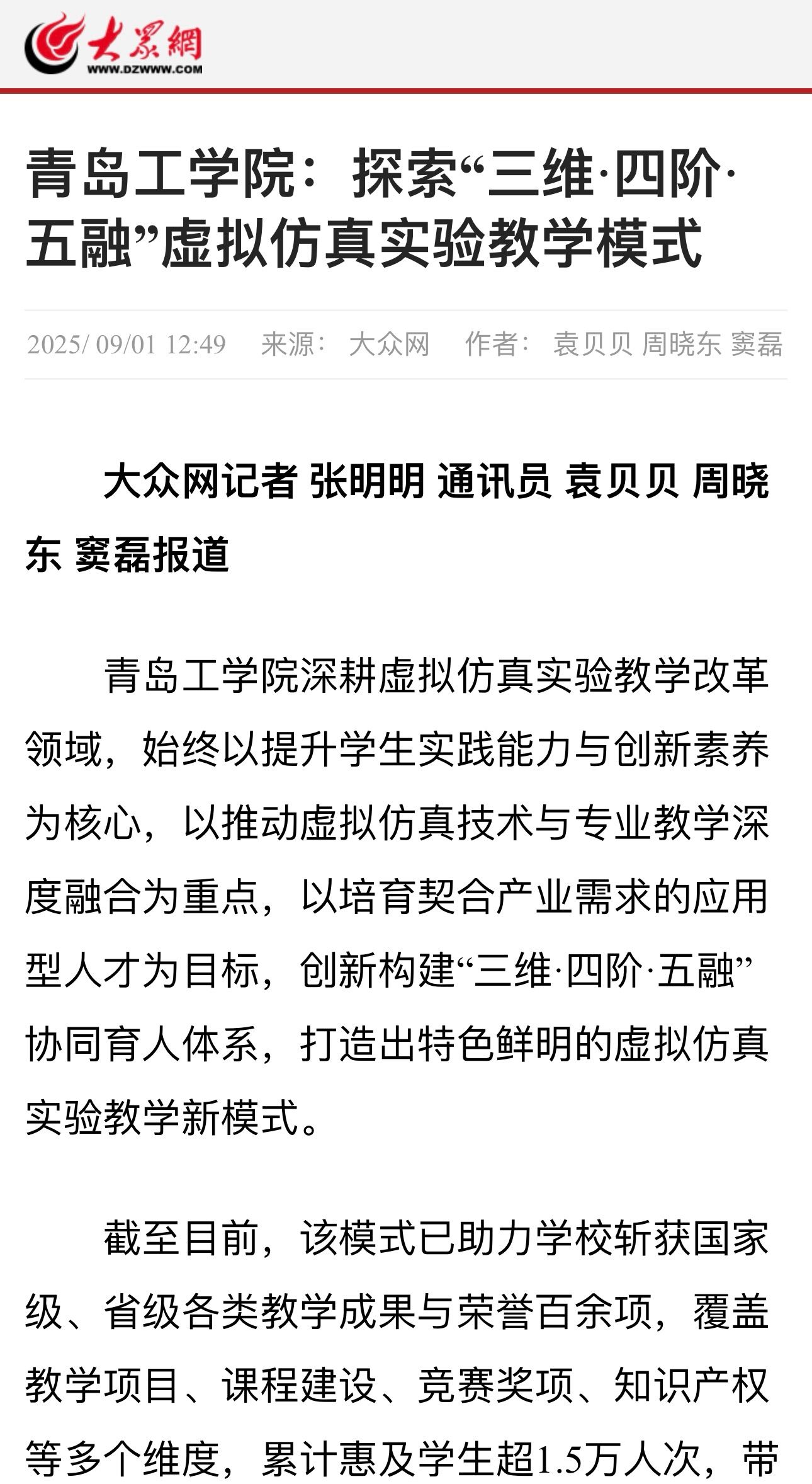 青岛工学院:探索“三维·四阶·五融”虚拟仿真实验教学模式
