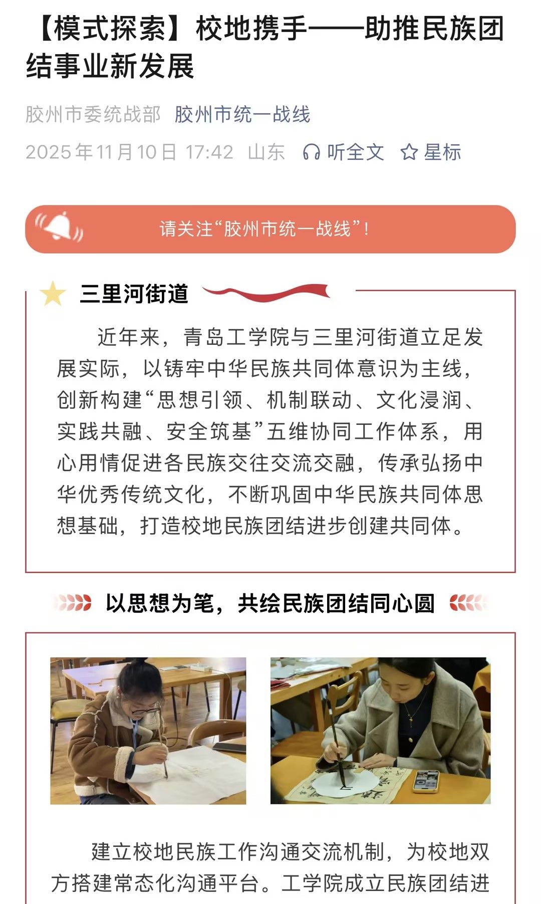 《胶州市统一战线》丨[模式探索]校地携手——助推民族团结事业新发展