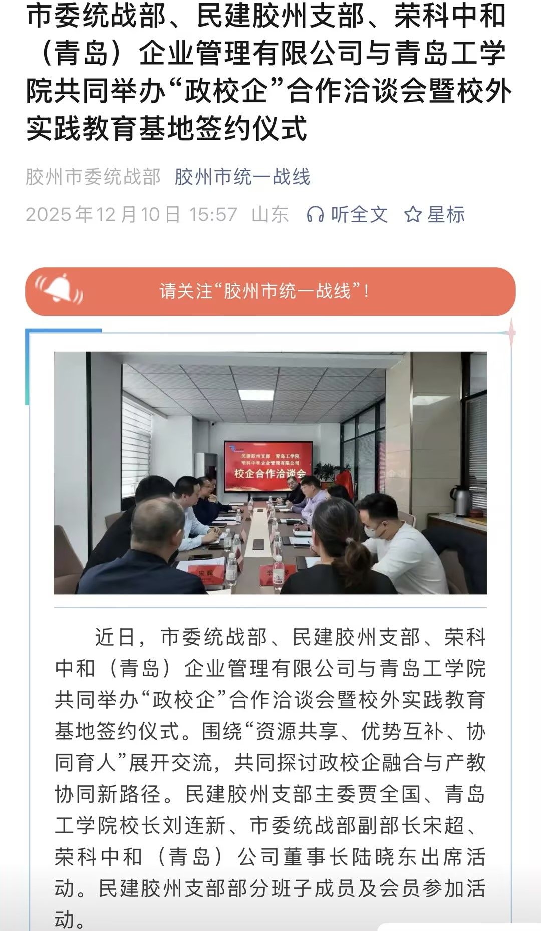 《胶州市统一战线》丨市委统战部、民建胶州支部、荣科中和(青岛)企业管理有限公司与青岛工学院共同举办“政校企”合作洽谈会暨校外实践教育基地签约仪式