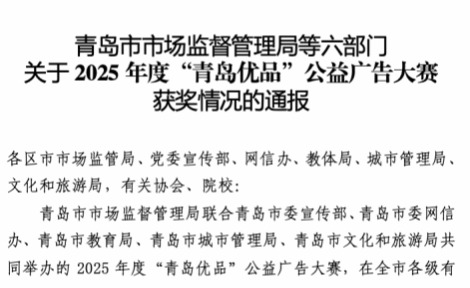 近日,由青岛市市场监督管理局联合市委宣传部、网信办等六部门共同举办的2025年度“青岛优品”公益广告大赛获奖情况正式通报。我校获优秀组织奖,我校设计艺术与传媒学院学生凭借扎实的专业功底与创新的创作理念,在全市1319件参赛作品中脱颖而出,斩获银奖1项、优秀奖1项。