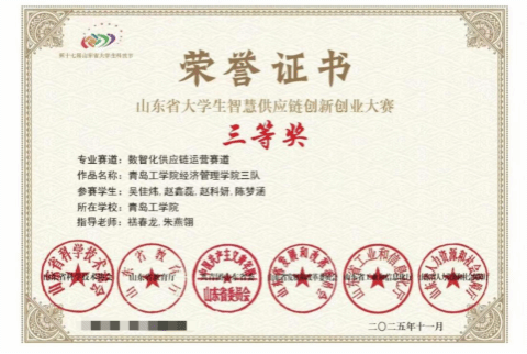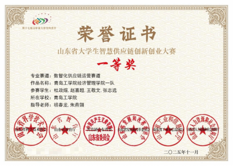 第十七届山东省大学生科技节智慧供应链创新创业大赛于2025年11月1日落幕,我校经济管理学院禚春龙、朱燕翎老师带领“青岛工学院经济管理学院一队”(杜政煊、赵喜超、王敬文、张志远)获得“本科组一等奖”,“青岛工学院经济管理学院二队”(桑伊村、郑宇菲、孙悦寒、李曦煜)获得“本科组二等奖”,“青岛工学院经济管理学院三队”(吴佳炜,赵鑫磊,赵科妍,陈梦涵)获得“本科组三等奖”。大赛由山东省科学技术协会联合山东省教育厅、共青团山东省委、山东省发展和改革委员会、山东省工业和信息化厅、山东省人力资源和社会保障厅共同主办,山东科技咨询协会、济南工程职业技术学院承办,上海百蝶教育科技有限公司、济南华峻科技有限公司提供技术支持。