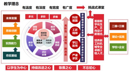 课程秉承“四心四度三结合”总体教学理念,以四心为本,关注学生未来发展,确定逐层递进的四阶课程目标。着眼于工程正向设计新趋势,紧跟数字化生产对工程图学的新要求,聚焦“图样”与“工程表达”,重构教学内容,多元融合教学资源,构建多维评价体系,打造四度挑战式课堂。践行二维与三维相结合、理论与实践相结合、学校与企业相结合的三结合教学策略。旨在培养学生图学高阶思维,实现学生工程表达能力、思维创新及综合素养不断提升。
