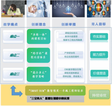 课程紧扣新工科教育标准,以“多维度整合”为教学目标,全方位提升学生的专业素养和综合能力。内容体系打破传统建筑建模局限,融入结构工程、智能建造、绿色建筑、人工智能和伦理道德等跨学科知识,并与BIM企业深度合作,引入前沿行业资源,增强课程深度与挑战性,为学生就业竞争力提供有力支撑。