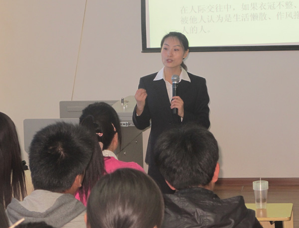 本次讲座特别邀请移动公司优秀礼仪培训师杜树菲老师主讲。杜老师就学习礼仪的意义、仪容、仪表、仪态、师生交往礼仪、日常交往礼仪、公共场所礼仪等几个方面进行了详细讲解。她生动幽默的讲解获得了同学们的一致好评。