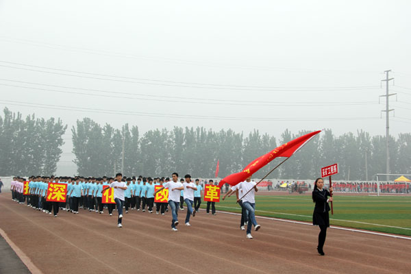 上午8时,伴随着激昂的运动员进行曲,学院仪仗队率先走过主席台。裁判员队、各系、区代表方队,依次迈着矫健的步伐、喊着嘹亮的口号,整齐走过主席台接受检阅。昂扬的风貌、自信的微笑,响亮的口号,表达了同学们积极向上、建设五型校园、美丽校园的信心和决心,引起了现场热烈的掌声。