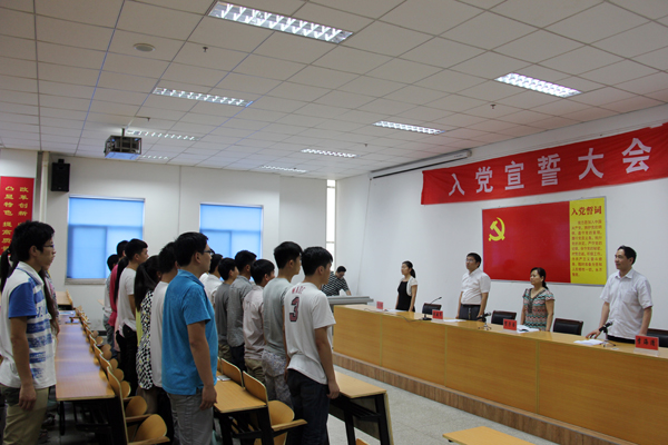 大会在国际歌声中拉开序幕。首先,组织人事处李海清同志宣读了我院2014年转正人员名单及新发展人员名单。然后,30位新发展党员面对鲜艳的党旗,在领誓人李雪莲同志带领下庄严宣誓,贺子杏同志监誓。接下来由祝慧宁同志代表新党员发言。最后,黄建军同志发表讲话。黄书记首先对新发展党员表示祝贺,然后给新发展党员提出三个希望,希望大家能继续加强对政治的学习,关心国家发展,提高个人的政治素养;希望大家能认真学习专业知识,认真对待考试,起好先锋模范作用;希望大家平时严格要求自己,规范自己的行为,做个有修养的人。