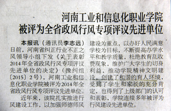 日前,河南省纠正行业不正之风领导小组下发了《关于表彰2014年全省政风行风专项评议先进单位的决定》(豫纠组〔2015〕2号)文件,我院被评为2014年“全省政风行风专项评议先进单位”。