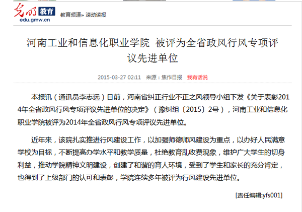 近日,《焦作日报》、光明网教育频道、华北新闻网等媒体对此进行了相继报道。近年来,我院以加强师德师风建设为重点,以办好人民满意学校为目标,不断提高办学水平和教学质量,扎实推进行风建设工作,得到了学生、家长、上级部门及社会各界的一致好评和充分肯定,连续多年被评为行风建设先进单位。