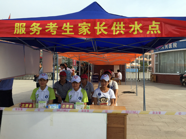 在志愿者服务点,志愿者们为考生和家长门提供了帐篷、凳子等避暑和休息的场所,同时还免费提供矿泉水。此外,志愿者们还精心准备了清凉油、藿香正气水、创可贴等物品,以备不时之需。在考生等待入场的时候,志愿者们微笑着握拳鼓励加油,祝愿考生们沉着冷静,考出好成绩。