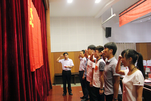 宣誓仪式在雄壮的国际歌声中拉开帷幕。在组织部部长刘士合同志的带领下,8名预备党员整齐肃立,举起右手,面向党旗,庄严宣誓。现场顿时响起了阵阵激昂的宣誓声,每名同志都用发自内心的声音表达对党的忠诚,面对党旗,大家接受了一次身心的特殊洗礼。宣誓结束后,预备党员黎永碧代表新党员郑重表态,在今后的工作、学习和生活中要严格要求自己,不断提高党性修养,带头践行社会主义核心价值观,以实际行动履行共产党员的职责和义务,努力发挥好党员的模范带头作用。