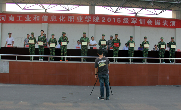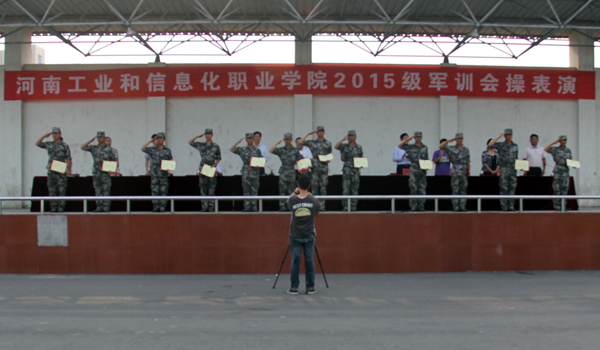 9月17日下午,我院2015级新生军训会操表演在田径运动场举行。院领导王海长、陈荣邦、席振修、邱雨生、学院相关处室和各系负责人、承训部队带队教官等观看了会操表演,并为受表彰的军训优秀教官和学生先进个人颁奖。王海长代表学院向承训部队赠送了锦旗。