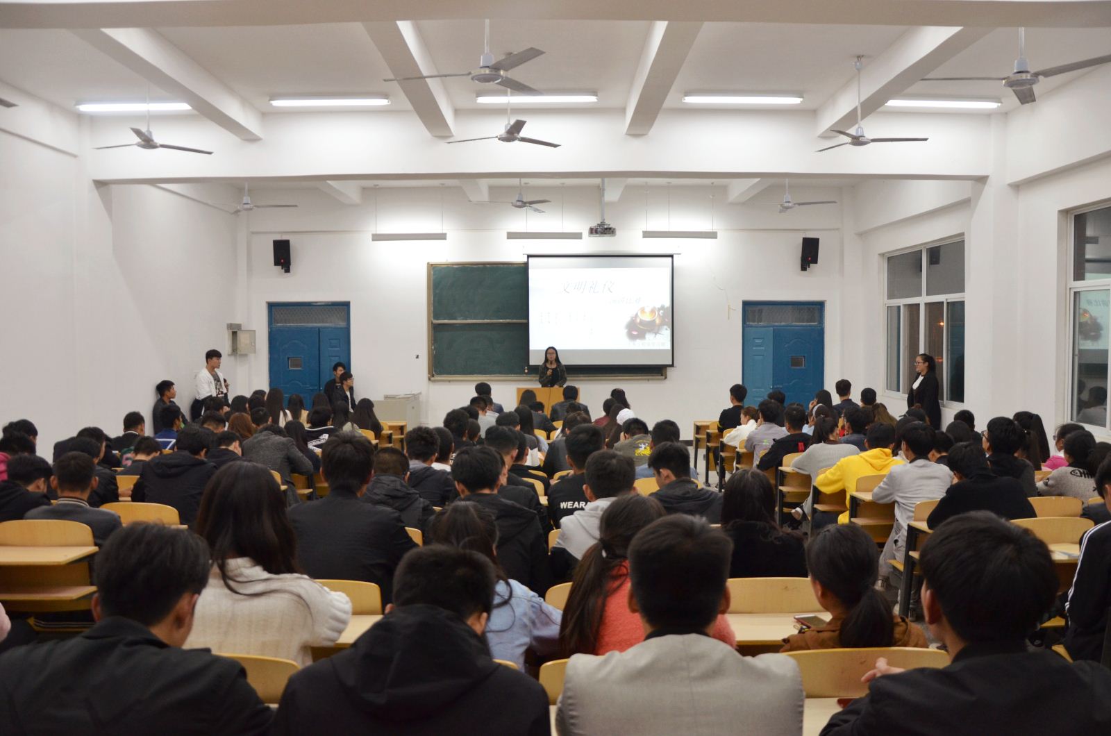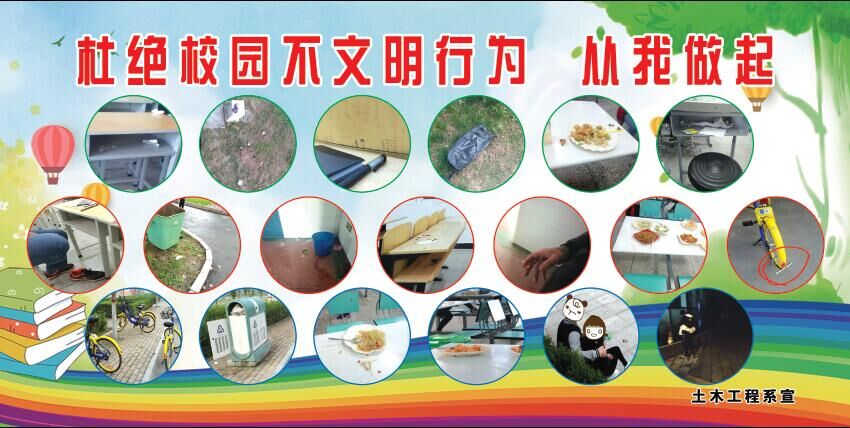本次活动共分为四个阶段。首先是召开主题班会。10月9日,土木工程系在全系范围内召开“文明礼仪我先行”主题班会,教育学生学习文明礼仪知识,号召学生培养良好的文明礼仪习惯。第二,举行校园不文明现象图片展。10月13日,土木工程系把日常从教室、宿舍、学苑餐厅以及其它公共场所收集到的学生不文明行为,以照片的形式集中进行展示,以真实事例引导学生反思,摒弃不良行为。第三,举办“文明礼仪我先行”演讲比赛。10月19日,土木工程系在“第二教学组团的2205教室举办了“文明礼仪我先行”演讲比赛。比赛过程中,现场观众在欣赏参赛选手精彩演讲的同时,也在文明礼仪、公德意识等方面受到了精神上的洗礼。第四,开展校园文明礼仪宣传推广活动。10月22日,向全院师生发出文明礼仪倡议书,10月25日,该系又在学苑餐厅前小广场举办了“文明礼仪伴我行”全院师生大签名活动。号召全体学生从我做起,践行文明礼仪,以昂扬、饱满的姿态迎接党的十九大胜利召开。