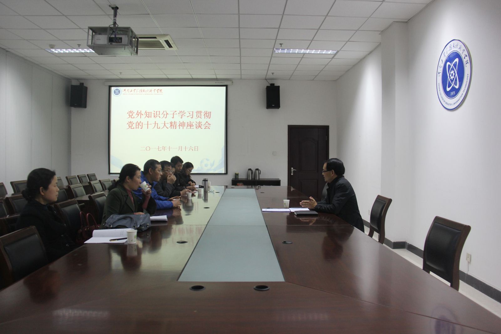 魏道清向与会人员介绍了学院学习贯彻党的十九大精神工作开展情况,并对学院党外知识分子、特别是高级知识分子学习贯彻党的十九大精神提出了具体要求。魏道清指出,党的十九大是在新的历史起点上开启党和国家新征程的一次大会,具有重大里程碑意义。深入学习、广泛宣传、全面贯彻党的十九大精神,是当前和今后一个时期的首要政治任务。各党外知识分子、民主党派要提高思想认识,按照上级要求和学校安排积极主动学习宣传贯彻党的十九大精神。在学习宣传贯彻党的十九大精神时要切实做到拥护以习近平同志为核心的党中央,自觉增强“四个意识”;切实做到领会党的十九大精神实质和丰富内涵;切实做到学以致用、敢于担当、主动作为,以优异的工作业绩推动学院事业实现新发展。