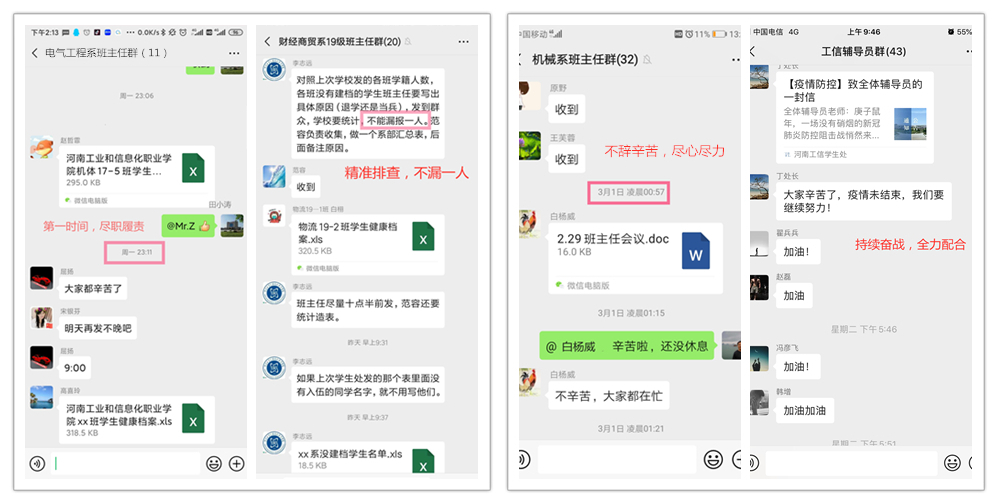 全力奋战一线,坚守岗位共克时艰。疫情防控期间,我院全体学工人员坚守岗位、奋战一线,在摸排中始终坚持以“第一时间”、“不漏一人”,全力做好学生动向摸排统计工作,动态掌握学生详细情况,及时准确上报各项数据。大家全天24小时处于战斗状态,并且克服了远程管理、居家办公等各种困难,常忙碌至深夜也无怨言。尤其是一线的班主任、辅导员们,他们在最紧要的关头,迎难而上,及时排解学生的心理困惑,筑牢疫情防控的安全防线。他们通过QQ群、微信群、电话、网络班会等渠道,耐心细致地向学生普及疫情防控知识。疫情无情人有情,一通通电话、一条条信息、一句句叮嘱,传达了浓厚的师生情谊,筑牢了广大工信学子的健康“防火墙”。