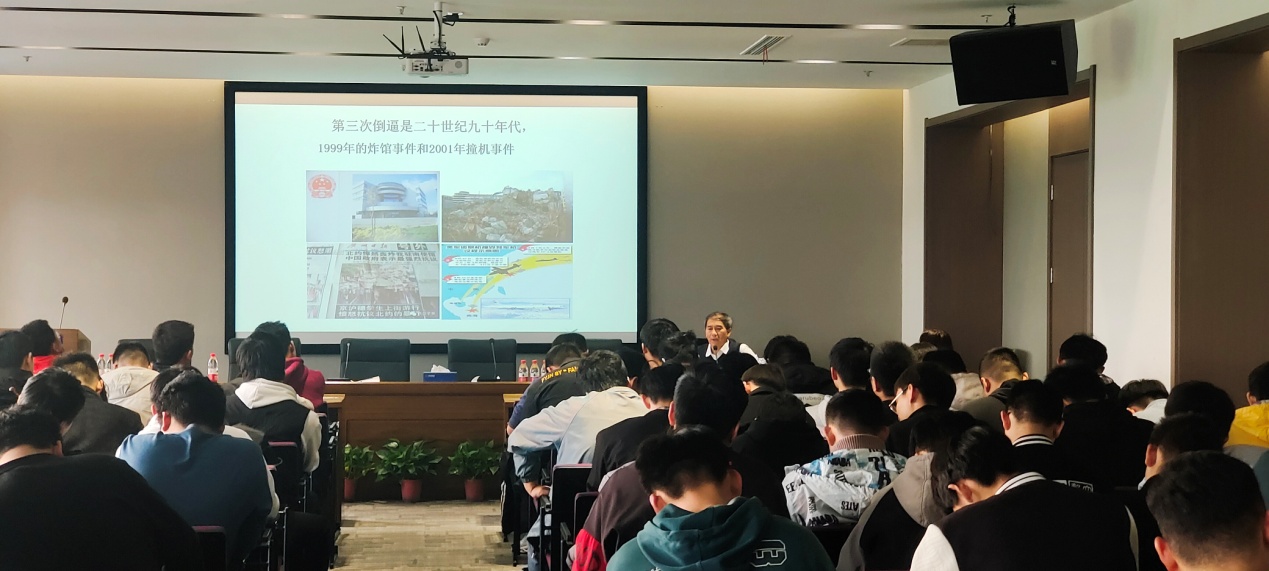 张树岭以“我国国家安全与中美关系”为主题,从中国外部安全环境新变化、我国对外政策调整及成果、中美关系的未来走向等三个方面,通过实际数据、鲜活事例、客观对比等方式,为学生上了一堂精彩生动的党课。