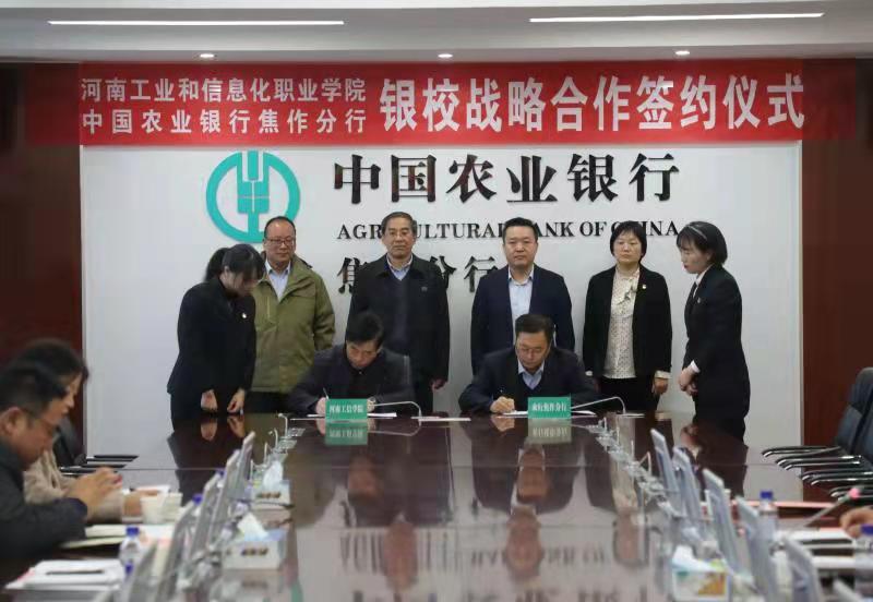 焦洪涛、栾华代表双方签署《河南工业和信息化职业学院-中国农业银行焦作分行银校战略合作协议》。