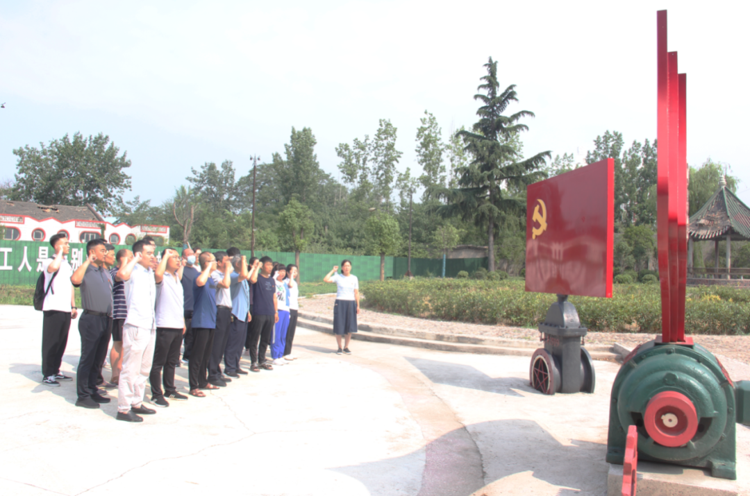 在工作人员的讲解和指引下,全体党员沿着历史的印记,先后参观了原焦作矿区人民委员会旧址、红色小礼堂、英式矿井架、坑口电厂遗址、英雄广场、王封档案楼、习仲勋副总理考察“西大井”时的陈列室等,聆听着一个个煤矿老物件背后的故事。随后,集体观看了专题片《百年王封的邀请》,了解百年王封矿的艰辛历程,感受催人奋进的红色精神。1925年焦作煤矿工人大罢工,有力地声援了上海五卅运动,沉重打击了帝国主义的嚣张气焰,彰显了焦作工人阶级的强大力量,毛泽东同志盛赞焦作煤矿工人“特别能战斗”。在焦作煤矿工人大罢工发起地——英雄广场,全体党员面对鲜红的党旗,举起右拳,庄严宣誓。重温誓言,铭记下对党矢志不渝的坚定信念。