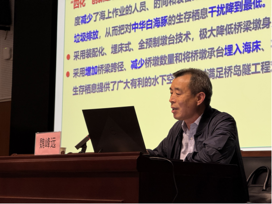 魏峰远教授以港珠澳大桥建设这一“超级工程”为切入点,生动讲述了建设过程中面临的巨大挑战与技术创新应用。他强调,港珠澳大桥的成功不仅是中国工程技术的辉煌成就,更是无数建设者精益求精、追求卓越的工匠精神的集中体现。魏教授鼓励在场师生要树立远大志向,以“大国工匠”为目标,在各自领域深耕细作,为国家发展贡献力量。
