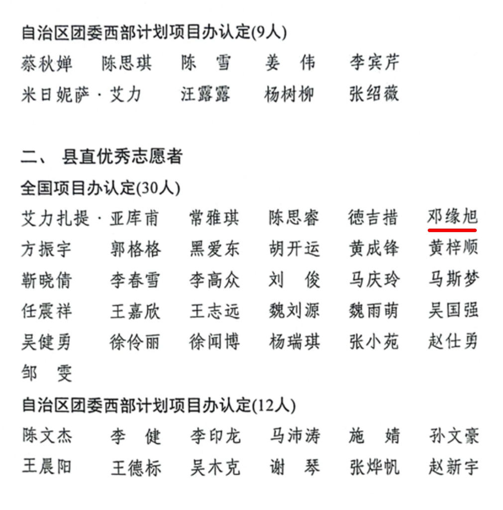 近日,新疆维吾尔自治区布尔津县发布2024-2025年度考核优秀西部计划志愿者名单,我校智能制造学院2024届优秀毕业生邓缘旭因在西部计划服务期间表现突出,荣获全国项目办认定的县直优秀志愿者,展现了新时代青年扎根基层、奉献祖国的责任担当。