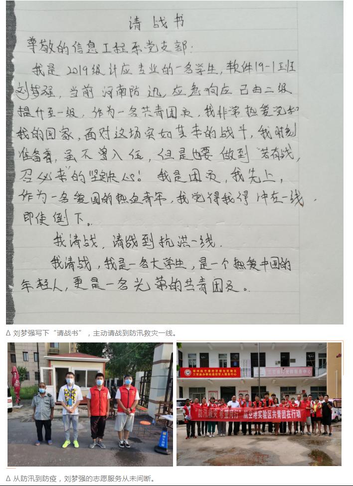 8月10日“河南共青团”微信公众号以《青春“志愿红”闪亮战“疫”一线”》为题转载了来自《河南青年时报》的新闻报道,新闻记者魏文杰采写报道了我院软件19-1班刘梦强参加防汛抗疫志愿服务的先进事迹。