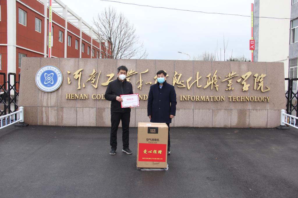 3月25日下午,焦作市海康电子设备有限公司向我院捐赠了价值万余元的AOE冠状病毒消毒机,助力学院新冠肺炎疫情防控工作。院长焦洪涛代表学院接受捐赠,办公室主任赵少华参加捐赠仪式。