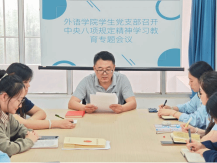 为深入贯彻中央八项规定精神学习教育,加强学生党员的纪律意识和作风建设,5月15日,外语学院学生党支部在1317召开了《深入贯彻中央八项规定精神学习教育》文件学习专题会议。会议由学生党支部书记孙晓东主持,支部全体党员参加。