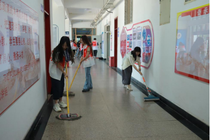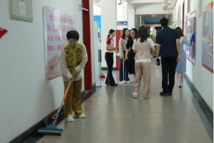 师生党员热情饱满,迅速投入劳动实践。本次清洁的重点区域是四号教学楼的大厅、走廊及周边地带,包括邻近的绿化带和草坪。大家手持清洁工具,认真清扫地面,仔细擦拭宣传栏、门窗,并重点清理了卫生死角和绿化带中隐藏的纸屑、烟头等杂物。对楼内的党建宣传栏、党员活动室也进行了彻底的清洁维护。刘晓燕和付国花全程参与,以实际行动作表率,与大家亲切交流、并肩劳动。