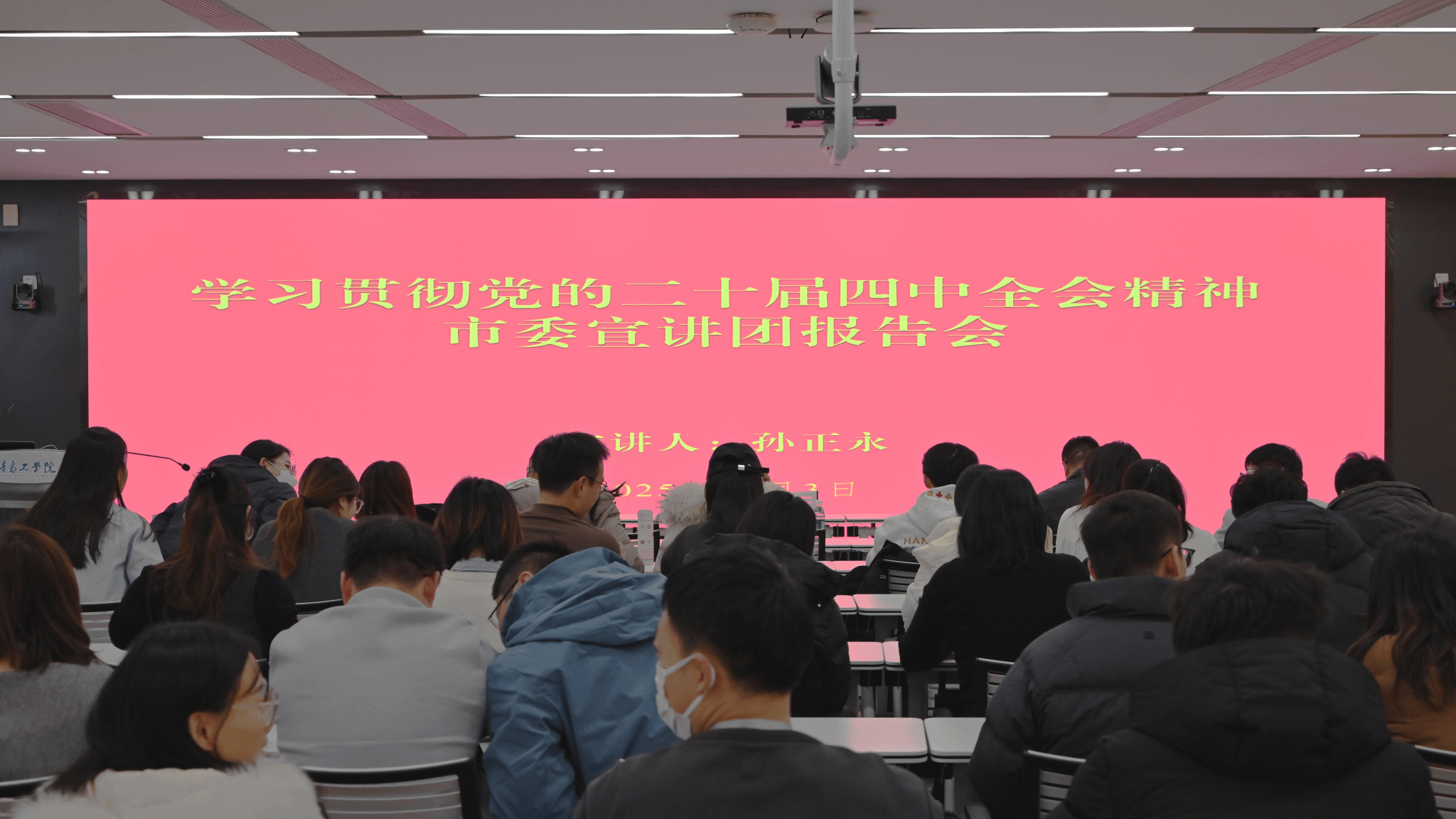青岛工学院中层领导干部、辅导员代表、马克思主义学院教师,学生干部代表等100余人参加报告会。