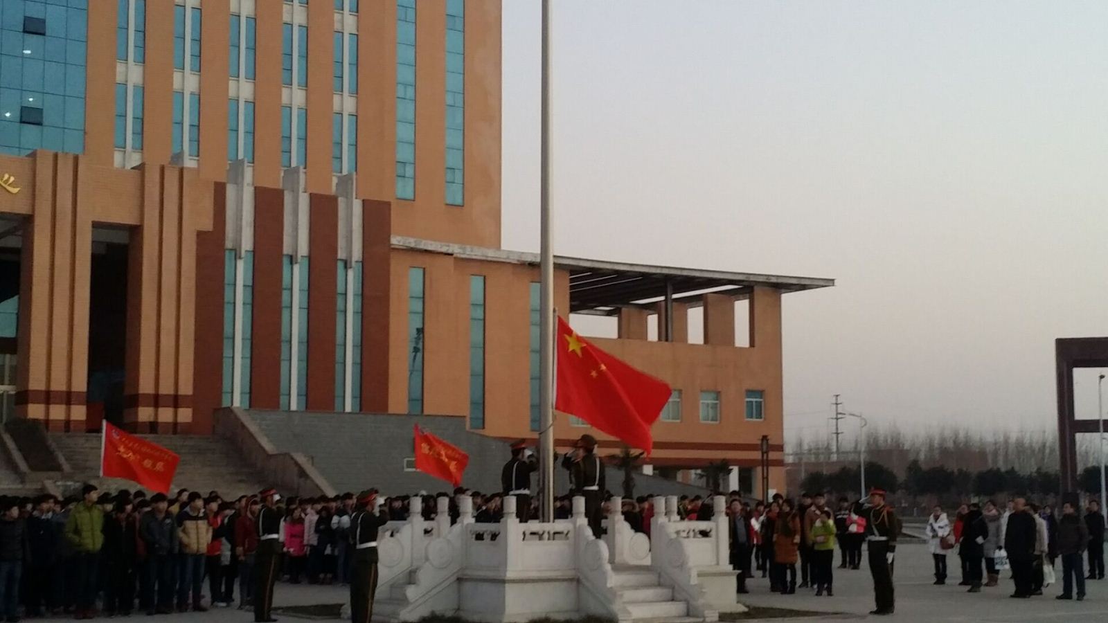 为进一步加强爱国主义教育,引导学生以更加饱满的精神状态迎接2016年的到来,2015年12月30日,我院师生隆重集会,举行了2015年度最后一次升旗仪式。