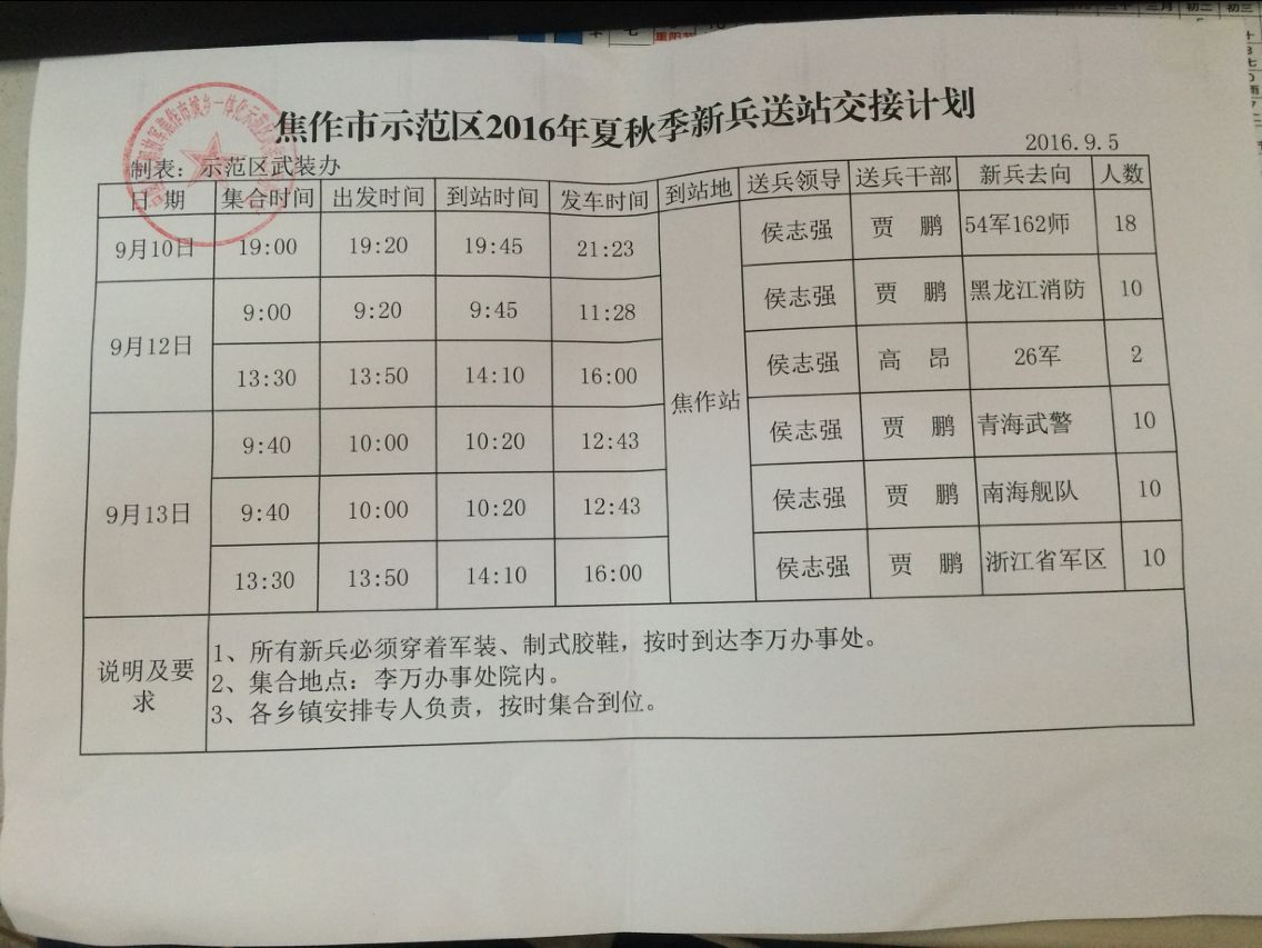 2016年9月7日,我院武装部参加示范区2016年运兵工作会议,新兵送站交接计划如下: