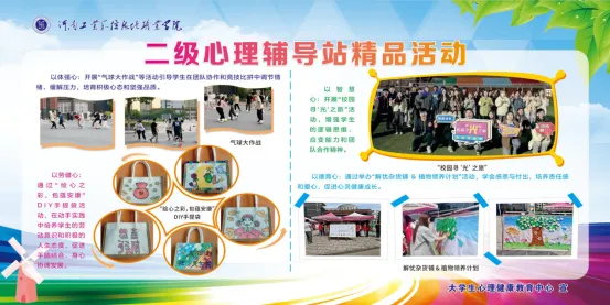 为体现我校各二级学院专业特色,加强二级心理辅导站精品建设,特组织形式多样、种类丰富、覆盖面广、学生参与度高的二级心理辅导站精品特色活动。