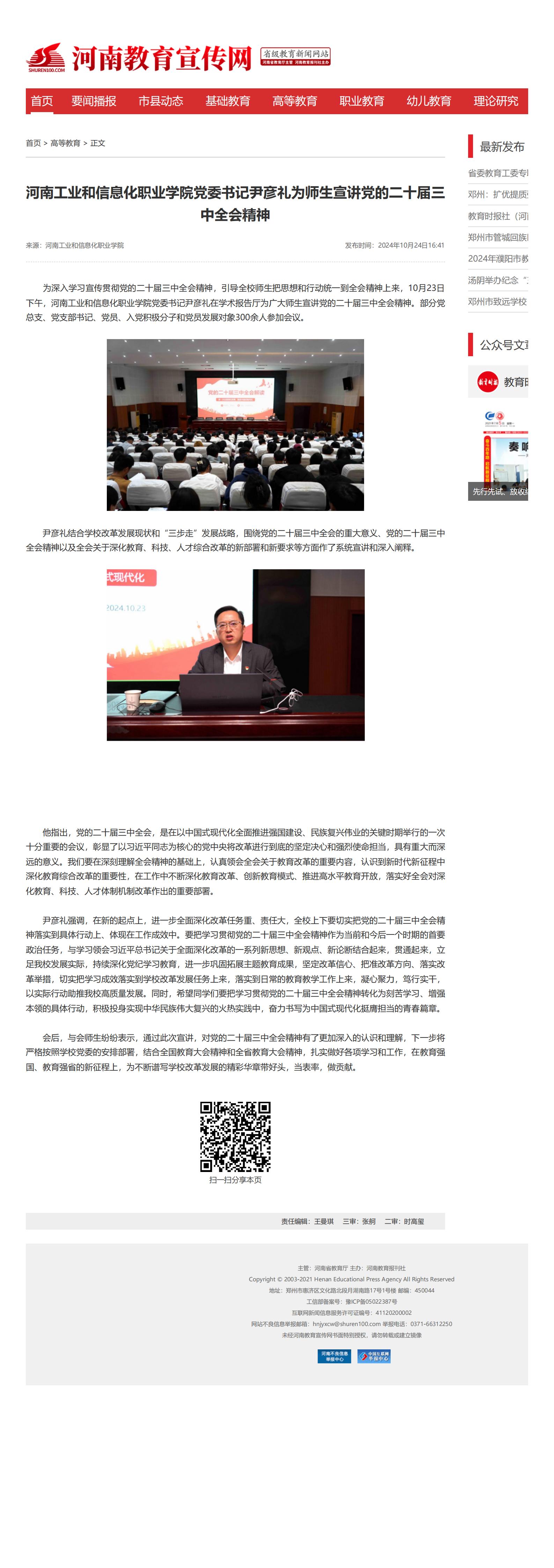 《河南教育宣传网2024-10-24》报道我校党委书记尹彦礼为师生宣讲党的二十届三中全会精神