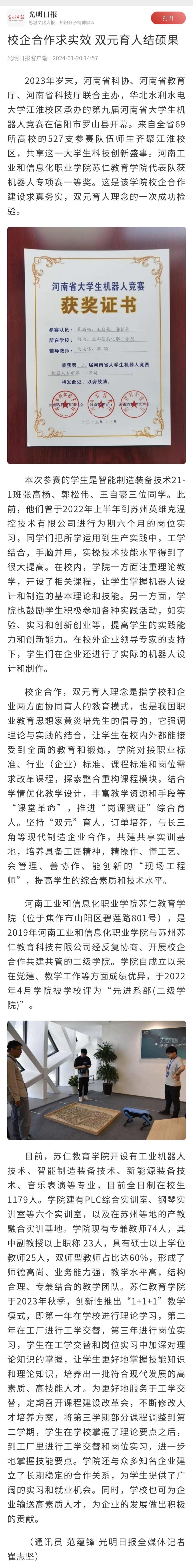 《光明日报2024-1-20》报道我校校企合作建设情况