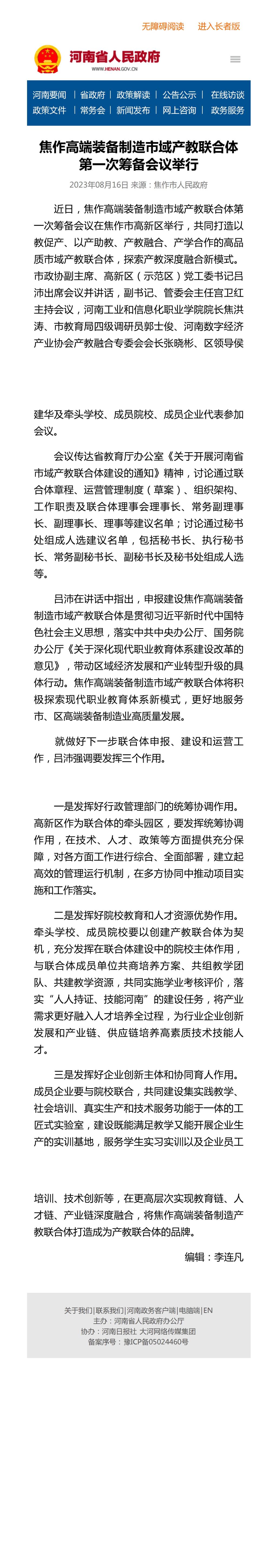 《河南省人民政府2023-8-16》报道我校校长焦洪涛参加焦作高端装备制造市域产教联合体第一次筹备会议
