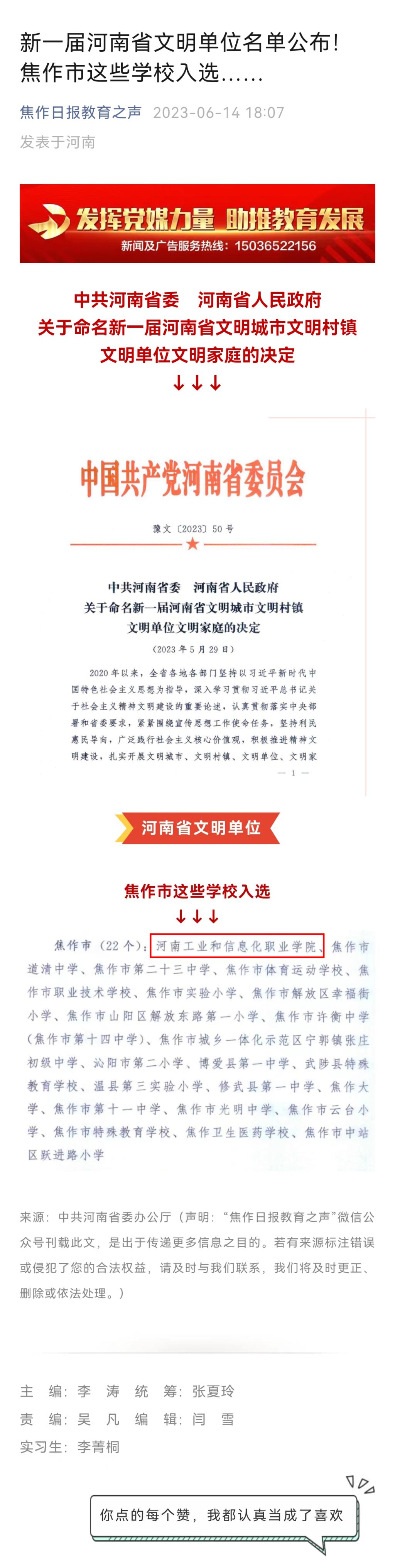 《焦作日报2023-6-14》报道我校荣获“河南省文明校园”称号