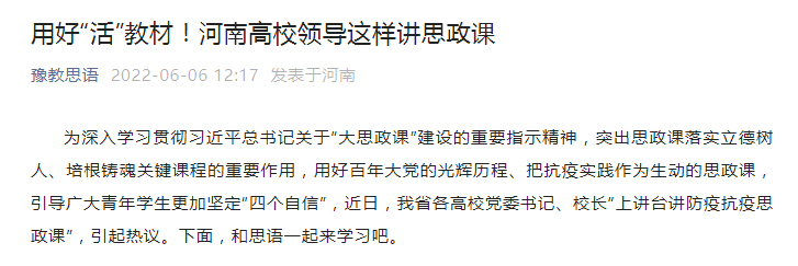《豫教思语2022-06-06》报道我院党委书记张树岭为学生讲授防疫抗疫思政课