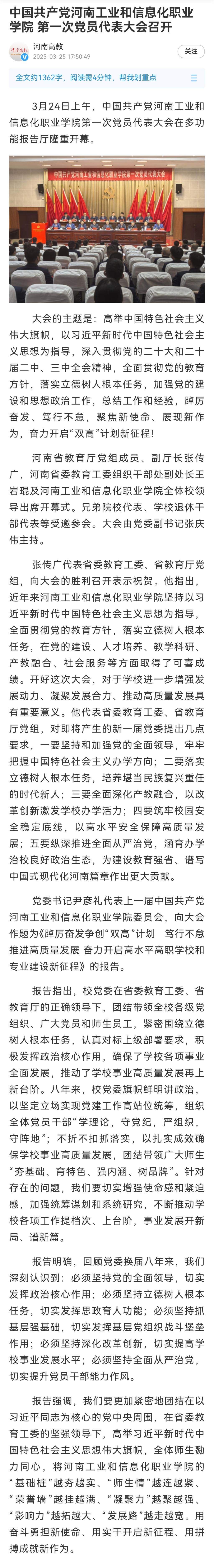 《河南高教 2025-3-25》报道中国共产党河南工业和信息化职业学院第一次党员代表大会召开