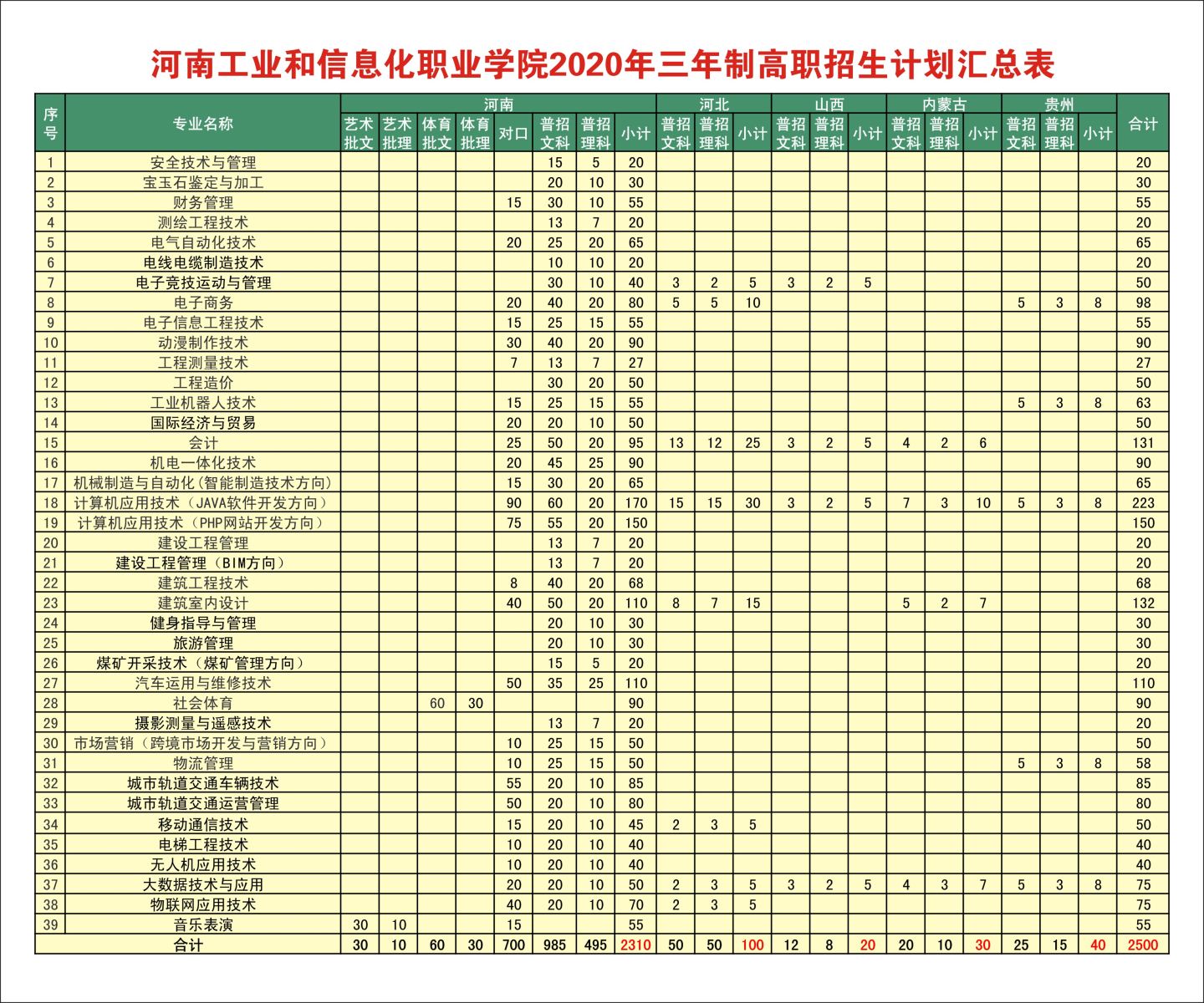 河南工业和信息化职业学院2020年三年制高职普招(含对口)计划表