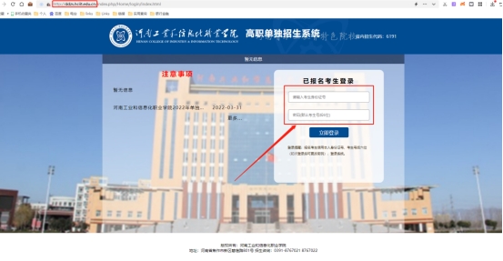 1.访问我校单招系统(网址:http://ddzs.hciit.edu.cn/),建议使用360浏览器或者谷歌浏览器,输入本人身份证号和考生号后6位登录系统(初次登录后可更改密码)。