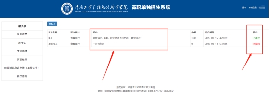 4.考生上传的证书经我校集中审核后,将通过本系统反馈审核结果。届时点击左侧“职业测试免试申请(上传证书)”按钮可以查看审核结果。